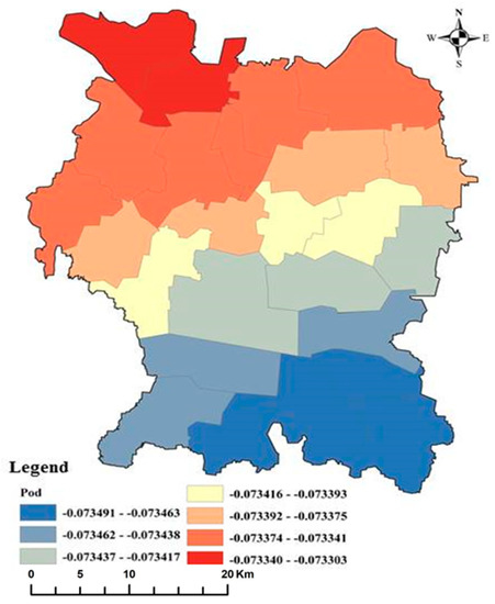 Pod’s regression coefficient distribution centered on the north of Zhuanlu Town and Pangcun Town; it had a layered decline from the northwest to the southeast and formed four low-value centers in Ziwei Town, Liqingu Town, Xingyi Town, and Xicheng Town. This showed that the population density status had a greater effect on industrial land transfer prices in Zhuanlu Town and Pangcun Town than in the other 23 towns, but the impact on Ziwei Town, Liqingu Town, Xingyi Town, and Xicheng Town was not obvious (Figure 7). Specifically, a higher population density supports a greater workforce and more factories. This finding confirms that these towns have a large population density, a greater demand for land, and higher land prices.