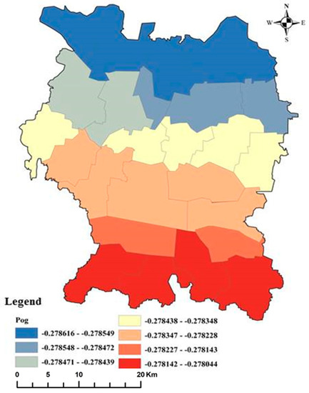 The regression coefficient distribution of Pog centered on the south of Xizhong Town, Ziwei Town, Liqingu Town, and Xingyi Town; it had a layered decline from the south to the north and formed four low-value centers in Zhuanlu Town, Qingfengdian Town, Pangcun Town, and Liuzao Town. This indicated that the population growth situation had a significantly greater effect on the price of industrial land transfer in Xizhong Town than in the other 21 towns, but the impact on Zhuanlu Town, Qingfengdian Town, Pangcun Town, and Liuzao Town in the north was not obvious (Figure 8). This also confirms that the population, as the main consumer of land, and its growth, have a significant positive impact on regional residential land prices.
