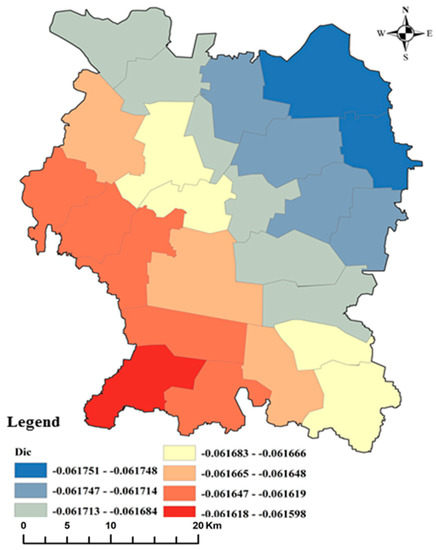 Distance from the economic center also plays an important role in the industrial land transfer price [81,82,83,84]. Dic’s regression coefficient distribution centered on the south of Xizhong Town; it had a layered decline from the southeast to the northwest and had two low-value centers in Liuzao Town and Daxinzhaung Town in the north. This indicated that the distance from a town to the city seat had a significantly greater effect on the price of industrial land transfer in Xizhong Town than in the other 24 towns, but the impact on Liuzao Town and Daxinzhuang Town was not obvious (Figure 9).