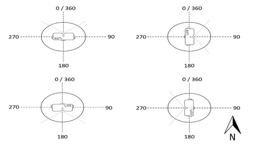 Orientation of VR headsets on observers during each one-minute view within the VR display room. Note the field of view from the headset is 110°, so some overlap between views was expected at each view point.