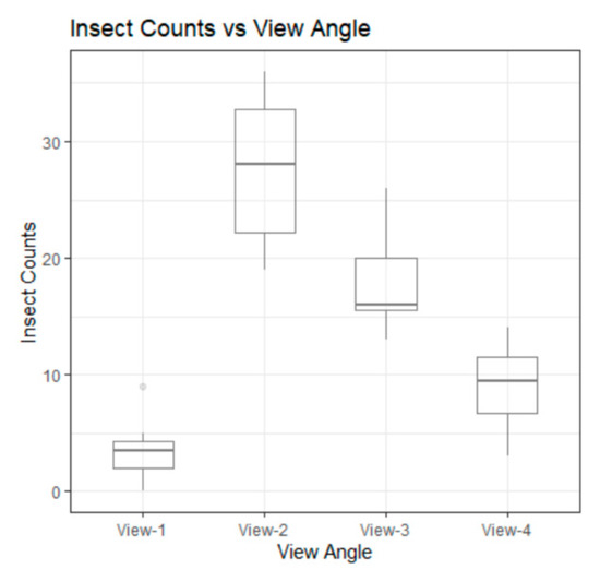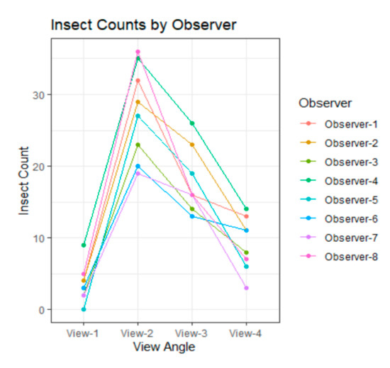 There was high variation among observers (Figure 2). All observers counted the most insects in view 2 and the least insects in view 1, with views 3 and 4 being the second and third highest counts per observer, respectively. Differences in counts among observers could be due to various comfort levels using VR headsets or various experience counting insects. Observer 1 almost always had the highest count per view, whereas observers 3, 6, and 7 were always lower than other observers in insect counts per view.