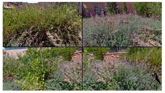 Actual view from each angle. View 1 (a) was dominated by Potentilla fruticosa ‘Katherine Dykes’. View 2 (b) was dominated by Perovskia atriplicifolia ‘Little Spire’. View 3 (c) was mixed between Amelanchier grandiflora ‘Katherine Dykes’ and Perovskia atriplicifolia ‘Little Spire’. View 4 (d) was mixed between Perovskia atriplicifolia ‘Little Spire’ and Potentilla fruticosa ‘Katherine Dykes.’.