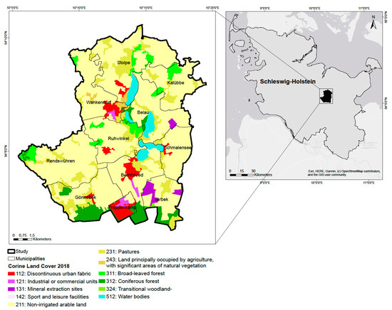 Location of the study area in northern Germany (on the right) and distribution of administrative districts and Corine land-cover classes (CLC2018) (on the left).