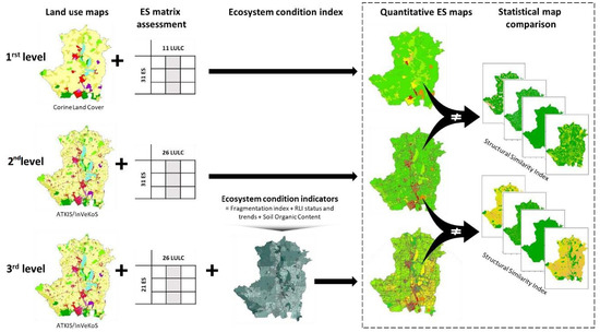 This paper explores how different levels of spatial resolution and ES matrix assessment complexity impact the outcomes of a local-scale analysis by applying three different levels of assessment. Using the ES matrix approach, we first examine how spatial resolution influences the assessment by comparing predicted ES potentials based on the open-access CLC dataset with the ATKIS (authoritative topographic and cartographic information system)/InVeKoS (Integrated Administration and Control System) datasets, which have a finer spatial resolution and include small habitats and landscape elements. We then select and calculate ecosystem condition indicators based on the fifth mapping and assessment of ecosystems and their services (MES) report (http://biodiversity.europa.eu/mes) to develop an ecosystem condition index. This assessment level combines the resulting index with the ES potential matrix to analyze how data on ecosystem condition influence the outputs of ES assessments. We applied these three assessment methods in a case study area in northern Germany.