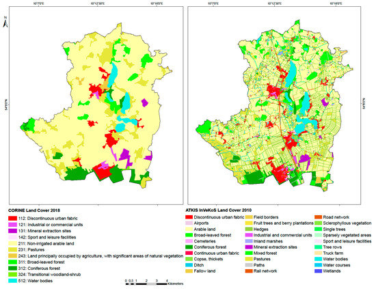Differences in land use/land cover data (LULC) classes shares in the study area in 2018 (CLC) and 2010 (ATKIS/InVeKos) for the two LULC datasets.