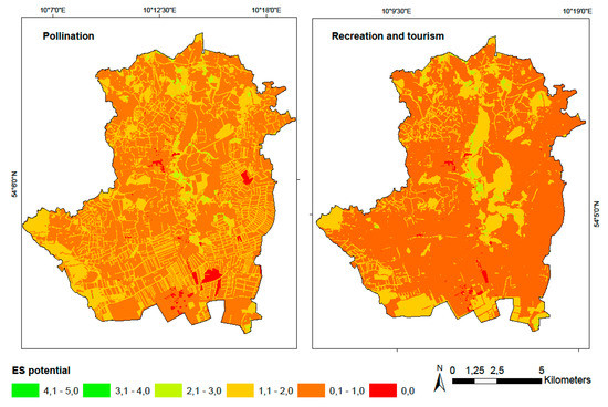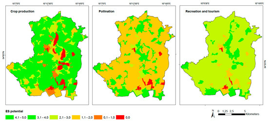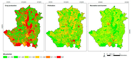 Ecosystem mapping was carried out for the CSA using CLC (first assessment level) and ATKIS/InVeKoS (second assessment level) datasets. All spatial analyses were executed using ArcGis 10.6.1. ES potential maps were obtained by joining each LULC map with the ES potential matrix. Exemplary ES potential maps (crop production, pollination and recreation and tourism) are presented in the results, the other maps can be found in the Supplementary Materials.