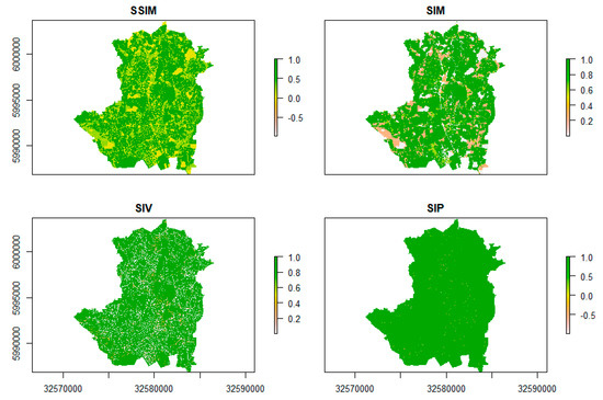 Map comparison between the crop production service potential with CLC and ATKIS/InVeKoS datasets. SSIM—structural similarity Index; SIM—similarity in means; SIV—similarity in variance; SIP—similarity in pattern of spatial covariance.