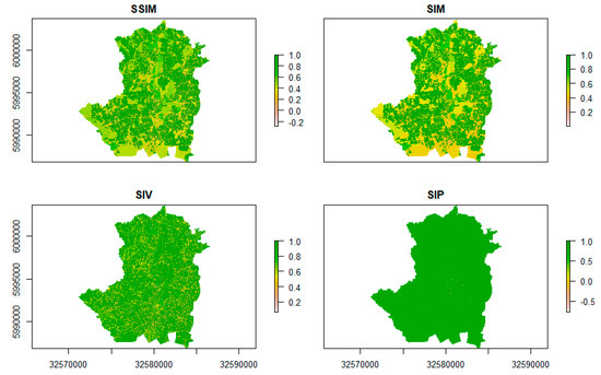 The resulting maps have similar ES potentials local abundance, variance and are highly correlated with a high to very high similarity in mean values (73.85 to 99.80% of the CSA has a SIM > 0.5), a high similarity in their variances (83.24 to 99.19% of the CSA has a SIV > 0.5) and a high positive spatial correlation (99.61 to 100% of the CSA has a SIP > 0) (Table S2 in the Supplementary Materials). Different patterns can be observed for the different ES and ES categories: the higher discrepancy between ES maps are for nutrient regulation, crop (Figure 7) and fiber productions, water purification and global climate regulation services, whereas minerals and fish provisioning have the lowest discrepancy. The differences between crop and fiber supply maps are mainly due to higher dissimilarity in local abundance, whereas the nutrient regulation maps differ in local abundance and variance. Cultural services tend to have a higher SIM than other services maps. Most of the regulation and maintenance services such as pollination, nutrient regulation and global climate regulation, but also cultural services and wild food production maps have a relatively lower SIV, whereas provisioning services are characterized by a high SIV (see Figure 7 for exemplary spatial agreement maps showing crop production services).
