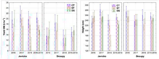 The mean production of the dry mass of silage maize in JEV (2016–2018) was statistically higher (p = 0.05; HSD test) in CT (20.4 t ha−1) compared with DS (15.8 t ha−1). No statistical differences were recorded in the ST treatment (Figure 2). The low yields at JEV’s DS treatment were influenced by later sowing, caused by the harvest of rye for silage, and at the same time by unfavourable weather in May (the month of planting) and in the summer months (a significant precipitation deficit and above–average air temperature–drought (see the current drought status available at www.intersucho.cz, run by National System for Monitoring Agricultural Drought in the Czech Republic). The mean production of dry mass of silage maize was comparable between all analysed treatments in SKO (without statistical differences; the mean yield of dry mass of silage maize ranged from 13.3 to 15.6 t ha−1). The average height of plants ranged from 2.24 to 2.56 m in both locations (without any statistical differences). The weight ratio of cobs (the weight of cobs/the weight of the whole plant) ranged from 56 to 58% in JEV and from 52 to 54% in SKO (no statistical differences). Higher weight ratio was always higher in DS treatment in comparison with CT.