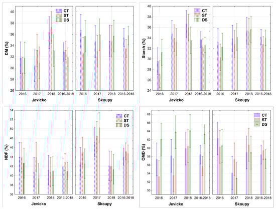 The forage quality parameters of maize in period 2016–2018. Note: DM—Dry Matter, NDF—Neutral Detergent Fibre, OMD—Organic Matter Digestibility.