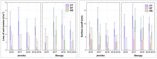 The surface runoff was also significantly affected by analysed treatments (Figure 4). The ST treatment significantly reduced surface runoff in both localities (HSD test, p = 0.05; LSD test, p = 0.01).