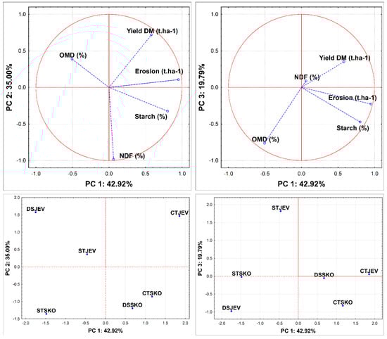On the plot of component weights PC1, PC2 and PC3 (Figure 5), the first three axes are significant because they contain together 97% of the variability. The PC1 axis on the PC1 × PC2 plot characterizes erosion (r = 0.95, positive relationship) and starch content (r = 0.80, positive relationship), parameters going along the axis and being in a strong and positive correlation. On the PC2 axis there is a significant correlation with NDF (r = −0.98, negative correlation) and grain yield (r = 0.72). A significant negative correlation with OMD (r = −0.76) is visible on the axis PC3 on the plot PC1 × PC3. The scatter plot (Figure 5) differentiates the treatments according to erosion and SC (PC1), yield (PC2) and OMD (PC3). The CT treatment was associated with high grain yields and low level of soil protection against erosion in both localities (JEV, SKO). The DS treatment was also connected with high yields and low level of protection against erosion, but only in the SKO locality. On the other hand, ST treatments proved to have a high level of protection against erosion in both localities, but this was counterbalanced by lower yield of dry matter. The forage quality, expressed by starch content, NDF and OMD, is similar in all treatments so the effect of analysed treatments on forage quality has no statistical significance. The ST treatment in JEV is on the PC1xPC3 chart at the top part because of the lower OMD compared with CT and DS treatments.