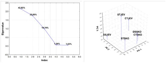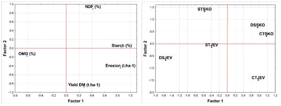 In addition to PCA, the FA differentiated CT (JEV and SKO) and DS (SKO) as treatments with high grain yields and low level of protection against erosion and ST (JEV, SKO) and DS (JEV) as treatments with high efficiency against erosion, but with low grain yields (Figure 6). The factor weights explain correlations between factors and attributes and mean the most important information, which helps to interpret the factors involved in the analysis. Factor 1 describes erosion and forage quality (starch content and OMD), while factor 2 describes grain yields and the NDF. The communality of a variable is thus the part of the variability of the variable which is explained by the factors. The maximum possible value of communality is equal to 1. This rank can be compared with a parameter (value R2), which we find out if we explain the original features (parameters) using linear regressions by determined factors []. According to Table 1 we can say that the communality reached very high value (higher than 0.75), and the values of the model parameters are very well taken into account by the proposed factor model.