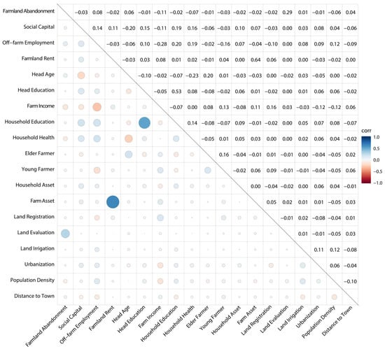 Correlations among variables help illuminate the structure of the data under investigation. Figure 3 shows a heat map of the correlations among the variables included in this study. In Figure 3, the darker the color (the longer the circle radius) means the greater the absolute value of the correlation coefficient between the variables. As indicated in Figure 3, the correlation coefficient between social capital and farmland abandonment is −0.03; this finding suggests that social capital may have a negative impact on farmland abandonment. In addition, the correlation coefficient between social capital and off-farm employment is 0.14, with the correlation coefficient between off-farm employment and farmland abandonment being 0.08. These findings suggest that social capital may increase the possibility of farmland abandonment by promoting off-farm employment. Meanwhile, the correlation coefficient between social capital and farmland rent is 0.11, and the correlation coefficient between farmland rent and farmland abandonment is −0.02. These patterns indicate that social capital may reduce the possibility of farmland abandonment by promoting farmers’ participation in the renting of available farmland.
