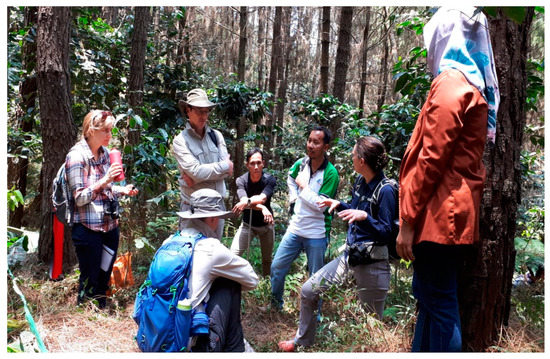 As a follow-up, after analyzing quantitative data, the researchers interviewed key farmers again to cross-check noteworthy quantitative data (such as the mode or extreme data) as a case for presentation (embedded analysis) [50]. Other techniques were used to triangulate: (1) nonparticipant observation (by observing the agroforestry setting/location); (2) member-checks” that is discussions with the key farmer and other farmers regarding the findings; (3) focus group discussions (FGD). The first FGD was conducted with 12 coffee farmers at the local meeting house to discuss the technical and social aspects of pine–based agroforestry cultivation. The second FGD was carried out in the local village meeting hall (Balai desa), by inviting key farmers (those who were the first to grow coffee or “the innovators”) and coffee farmer representatives (those who planted coffee afterward or “the followers”) and the stakeholders (representatives of the neighborhood and citizen associations, village officer, rural forest community member, village and sub-district officers, UB Forest employee, Perhutani/state-own forestry company agent and UB agroforestry research group members). In this activity, farmers were welcome to express their views on various issues, such as the relationship between the local community and the forest management authority, the history and quality of partnership, farmer economy and policy. These steps were useful to explore and describe sensitive issues and complexity of farmer livelihoods as the context which may influence their intentional behaviors. Field notes, camera imagery, and audio recordings were used to record the data. The data were recorded on a CD for storage only while useful for further intended research. Data are presented in an anonymized way to protect respondents.