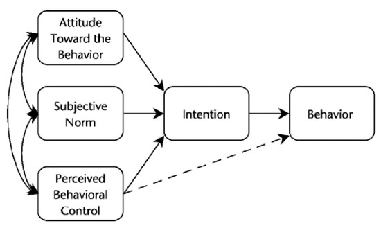 Typically, previous studies used “perception” and/or “attitude “as a determinant of adoption [37,38,39,40]. The TBP allows the variables of attitudes, subjective norms, and, perceived behavioral control to be combined as determinants of intention [41,42]. Furthermore, the self-efficacy variable (self-confidence) may be added to TBP to predict intentions. Hence, TBP can describe the behavior that is influenced by external factors (nonvolitional behavior) and self-efficacy as the individual’s internal factor [43].