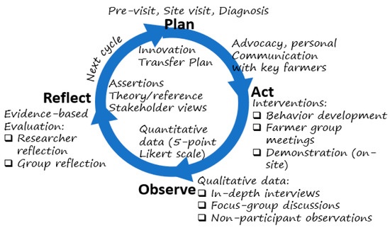 Reflect—Reflection was based on the research findings/evidence, which was applied through (1) individual/researcher evaluation; (2) discussions between researchers; and (3) stakeholder views through research finding seminar (involving resource person; a representative from university, governmental agents, NGOs, etc.); this is also a way to increase external validity. Subsequently, assertions/affirmation was conducted by clarifying the findings using the theory of planned behavior and other references and followed by giving options for further study and intervention approach.