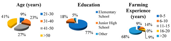 The agroforestry land in the UB-Forest area managed by the respondents of this study totaled 33.04 ha and the total area of UB-Forest is 544 ha. All respondent-farmers managed crops both in UB Forest 13.5 ha (pine-coffee agroforestry), but also in the state-owned forest (Perhutani) 18 ha (pine-vegetable agroforestry) and other forested areas 1.5 ha (pine-vegetables). Although, the survey data shows that the average of land areas managed by the respondent was relatively limited, at 1.2 ha (in Perhutani land); 0.7 ha (in UB Forest) and 0.5 ha (in farmer home gardens). The demographic data (Figure 5) show that 15 of 22 farmers (68%) have been farming within the agroforestry scheme for more than 20 years. Most respondents (41%) were in the >50-year age class and 77% of the farmers have had limited access to education being educated only to the elementary school level.