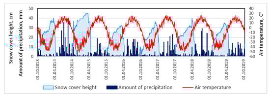 The unstable character of precipitation is one of the main effects of climate change. The variability in precipitation has a multidirectional character in Yakutia. On its territory, the mean annual range of precipitation is characterized by an interval of trend changes from −8 to 16 mm/10 years. Most of the territory of the Republic (about 73%) belongs to areas with positive trends, and about 27% belongs to areas with negative trends. In Northeast and Central Yakutia, trends of 4–8 mm/10 years dominate []. The change in the thermal regime of soils is affected not only by changes in air temperatures but also by the thickness of the snow cover [,]. Long-term observations in Central Yakutia show that the amplitude of fluctuations in the mean winter thickness of the snow cover has grown almost twice since 1997 []. An analysis of the long-term data from the Churapcha weather stations also shows significant fluctuations in the mean winter and maximum thickness snow cover in the Lena-Amga interfluve over the past 20 years (Figure 12).