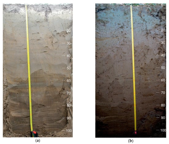 In this project’s framework, the specific fenced sites 7 × 7 m in size were used in the northern part of the alas to isolate vegetation from the effects of cattle and horses (Figure 3). The Carex duriuscula (Elytrigia-type) site was isolated from grazing on the upper zone, dominated by Elytrigia repens (L.) Nevski and Carex duriuscula C.F. Mey. Alas steppe soils develop here, the granulometric composition of which is classified as loamy sand (according to the United States Department of Agriculture USDA classification). In World Reference Base WRB, these soils can be classified as Mollic Folic Cryosols (Figure 4a). The Puccinellia-type area was isolated from grazing in the middle belt, dominated by Puccinellia tenuiflora (Griseb.) Scribner et Merr, and the main accompanying species are Suaeda corniculata (C.A. Mey.) and Knorringia sibirica (Laxm.) Tzvel. Alas meadow soils develop here, the granulometric composition of which is classified as loamy sand (according to the USDA classification). In WRB, these soils can be classified as Salic Stagnic Solonetz (Figure 4b).
