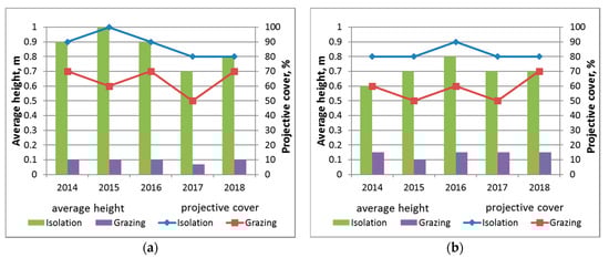 The foliage projective cover was always higher (from 80% to 100%) in an isolated area of the upper zone than in areas with constant grazing (50–70%) (Figure 5). A significant increase in the average height was observed in the first year of isolation (from 0.1 to 0.9 m), as was a gradual decrease in the number of species. The abundance of Elytrigia repens significantly increased and it became the only dominant species. Poa pratensis L. appeared in the community from cereals (Poaceae). Synanthropic species dropped out in the first few years of isolation (Table 1). Indicators of the foliage projective cover and average height of grass remained at the same level in constant grazing. The composition of dominants and the main accompanying species did not change for five years.