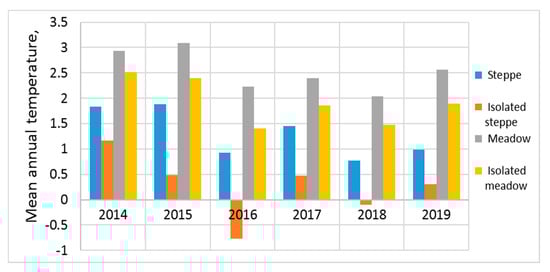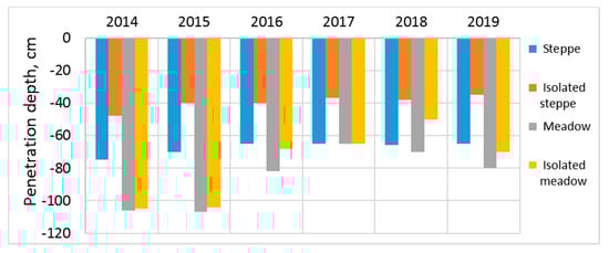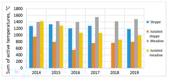 The sum of active temperatures at a depth of 0.2 m decreased noticeably during the steppe soil isolation. The difference in the sum of active temperatures between grazing and isolation after the first year of research was 300 °C; in subsequent years, the soil under the isolation became colder by 390–530 °C, and in some years this contrast reached up to 650 °C (Figure 7). The effect of isolation during the first two years was practically not observed in meadow soil. Only since the third year, the sum of active temperatures under isolation decreased by 480–560 °C. The meadow soil’s inertness is related to its high level of moisture, especially after a snowy winter. The previous years were characterized by a large amount of precipitation; therefore, the meadow soil saturated with moisture after isolation cooled much more slowly than the steppe soil.
