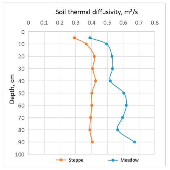 The significance of the differences in the thermal diffusivity of the steppe and meadow soils was assessed using the t-test.