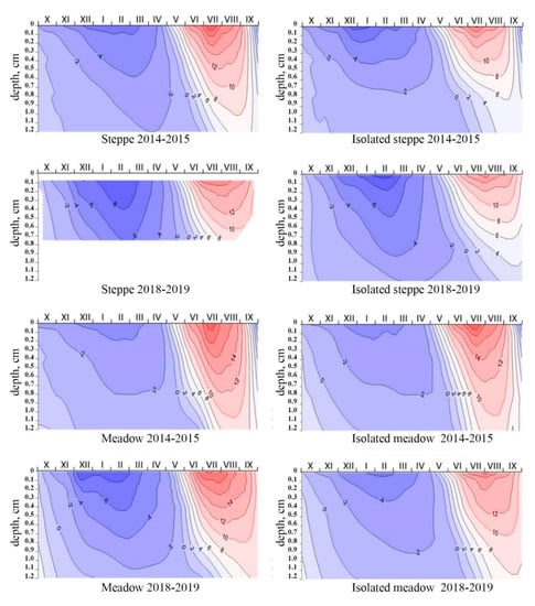 The penetration depth of negative temperatures decreased after isolation in the steppe soil, but the cooling of the upper humus layers increased. Apparently, the soil under the vegetation of isolated sites goes into “winter hibernation” in a dryer state and, accordingly, has less thermal conductivity than the soil under grazing. Therefore, cooling mainly occurs from the upper layers of the soil.