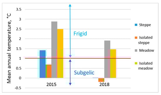 All the studied soils belong to the cold permafrost type according to the Russian classification system of temperature regimes. The main focus is on the temperature indicators of the root layer in this classification system. In soil taxonomy, the soil temperature reference site is either 50 cm below the soil surface or at the top of the root boundary layer—whichever is less. According to this system, the temperature regime of steppe soils belongs to the subgelic class, and the temperature regime of meadow soils belongs to the frigid class (Figure 11). In snowy years (2015), the steppe soil under the pasture becomes warmer and passes into the frigid class.