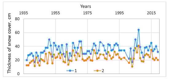 Dynamics of the maximum and mean depth of snow cover by surveys of snow cover (weather station Churapcha). 1—maximum thickness of the snow cover; 2—average thickness of the snow cover during the winter.