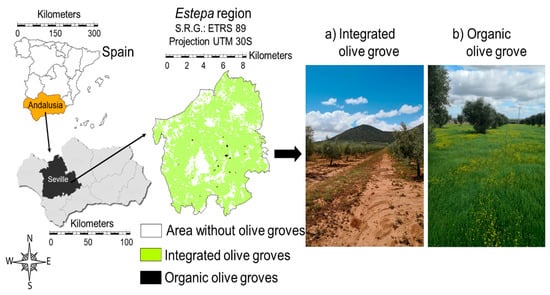 The geographical location of the PDO Estepa. Areas without olive groves, with integrated olive groves (a) and with organic olive groves (b) and images of the two types of management are shown.