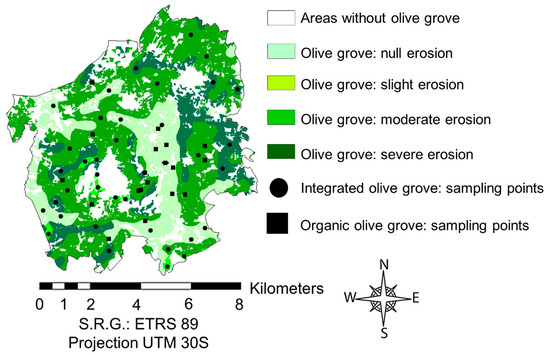 Based on this classification, while integrated olive plots were found in all erosion levels, for organic olive groves, only farms in the null and moderate erosive states were found. Through the combination of agricultural management and erosion levels, six different treatments were identified: integrated olive groves on soils with null, slight, moderate, and severe erosion; and organic olive groves on soils with null and moderate erosion. Additionally, in each treatment, a random sampling was carried out, selecting nine plots in each erosion level integrated olive groves, obtaining a sample size of n = 9 × 4 = 36 plots. On the other hand, all the organic olive grove plots were selected (n = 19 plots), from which 9 showed null erosion and 10 moderate erosion. Finally, the overall sample size was n = 55 plots (Figure 2).