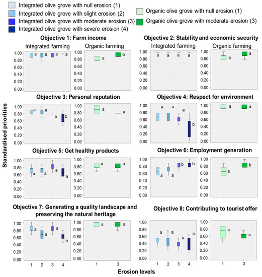 In the integrated management of the olive groves, the presence of two statistically differentiated groups was detected in the analysis of a greater personal reputation. In this sense, the plots with null and slight erosion (i.e., group a) showed a significantly higher weighting than plots with moderate and severe erosion (i.e., group b). Similarly, significant differences were also observed for the objective related to the employment generation, where plots with null and slight erosion (i.e., group a) showed significantly lower priorities than those evidenced by farmers with moderate and severe erosion plots (i.e., group b), the farmers of those plots giving greater importance to the achievement of this objective. For the objectives related to respect for the environment and the generation of a quality landscape and preservation of the natural heritage, two statistically differentiated groups were identified. This result showed that the owners of the plots with null, slight, and moderate erosion (i.e., group a) were, in a very significant way, higher than the priorities shown by the farmers with severely eroded plots (i.e., group b). For the organic management, very significant differences were observed according to the erosion level of the plots in relation to the farm income and the employment generation, with higher priorities in those plots with moderate erosion compared to plots with null erosion.
