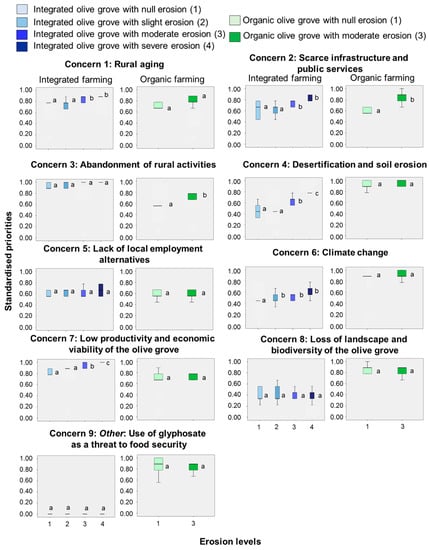 Boxplots showing the results of Tukey’s post-hoc analysis and the Kruskal–Wallis test for each concern evaluated in the integrated and organic olive groves according to their erosion levels. The letters inside each boxplot, indicate the classification groups generated to establish similar categories to each objective.