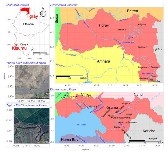 FBFS are being incorporated into national plans for agricultural development in both Kenya and Ethiopia [9]. A generic mapping approach suitable to FBFS settings could inform policy and help to assess and monitor the spatial coverage of the practice. We demonstrate this potential based on Kisumu County in Kenya and the Tigray region of Ethiopia where the practice of FBFS has strong economic and cultural importance. Both regions have long histories of flood-based agriculture but differ in the way floods are managed for agricultural purposes (Figure 1).