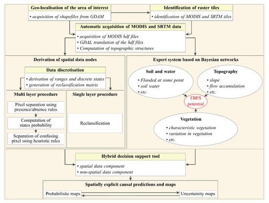 Assuming that some FBFS features may not be available as satellite images, we programmed the Bayesian network to accept both spatial (discrete raster) and nonspatial (multinomial probability distributions) data and used the model to predict FBFS potential based on the states of soil, water, vegetation, and topography (Figure 2). To automate the process, we first identified the study area in a geographic information system to acquire the spatial data. We then processed the MODIS and the SRTM data to compute several spatial data metrics based on the specifications of the Bayesian network and the type of data (e.g., single or multilayer raster). To account for the states of the different variables in the Bayesian network, we adopted a procedure that uses spatial (for both single and multilayer raster) and temporal variability (for multilayer raster only) to discretize the data. While the Bayesian network accepts both spatial and nonspatial data inputs, it always produces thematic predictions along with their uncertainties in a spatially explicit manner. The main idea consisted of reducing uncertainty along the Bayesian network topology such that the lowest possible uncertainty is achieved towards the node ‘FBFS potential’, which expresses the suitability of a given pixel for FBFS. For example, while wet soils are more likely to characterize FBFS settings compared to dry ones, the confidence in making this call would be higher if we also knew that the area had a gentle slope and high flow accumulation. Despite these water and topographic indicators, the area would not be identified as suitable for FBFS without evidence of vegetation.