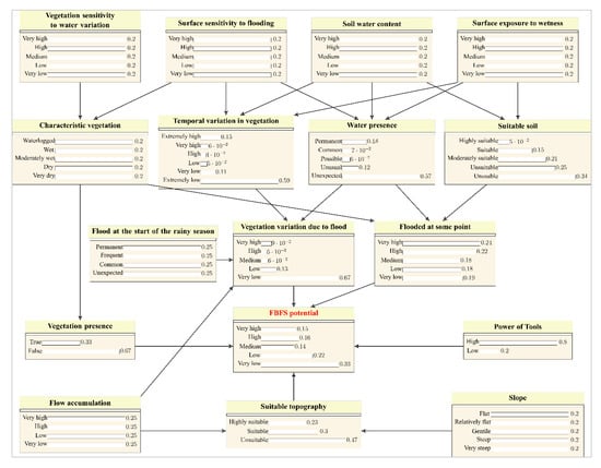 We reviewed the essential literature related to the topic of FBFS and conducted high-level discussions with 11 experts to draft the Bayesian network, which we then cross-checked based on farmer consultations and field observations. While the Bayesian network is essentially based on the expert-elicited data, we integrated the information acquired from the literature review and the discussions with the farmers to formalize the Bayesian network into a computer-readable model [29]. The literature review mostly focused on the FBLN database [9] and contributed to resolving conflicting points of view among experts. The field work and the discussions with the farmers mainly aimed at checking the validity of the probability distributions and the graphical structure of the model. To feed the Bayesian network, we generated 10 nodes as spatial data (i.e., Slope, Flow accumulation, Vegetation sensitivity to water variation, Surface sensitivity to flooding, Soil water content, Surface exposure to wetness, Temporal variation in vegetation, Water presence, Flood at the beginning of the rainy season, and Power of tools). We then used the Bayesian network to predict the likelihood of a pixel’s potential for FBFS (Figure 3, FBFS potential) based on the topographic suitability of the pixel for FBFS (Figure 3, Suitable topography), the presence of vegetation within the pixel (Figure 3, Vegetation presence), the potential of the pixel for floodwater (Figure 3, Flooded at some point), the variation of vegetation due to flood at the pixel (Figure 3, Vegetation variation due to flood), and the quality of the data (e.g., cloud cover and pixel quality assessment) used to feed the Bayesian network (Figure 3, Power of tools).