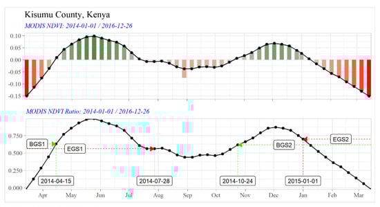 Vegetation seasonality in Kisumu County, Kenya based on a 3-year time series of Normalized Difference Vegetation Index from Moderate Resolution Imaging Spectroradiometer data (MODIS NDVI). EGS = end of growing season; BGS = beginning of growing season; the indices (1 and 2) indicate the first and second season, respectively. The top plot describes the evolution of the NDVI of an average pixel over time, with red bars showing senescent vegetation and green bars showing active vegetation. The bottom plot illustrates the computation of the length of the growing season based on NDVI ratio values derived from the NDVI values.