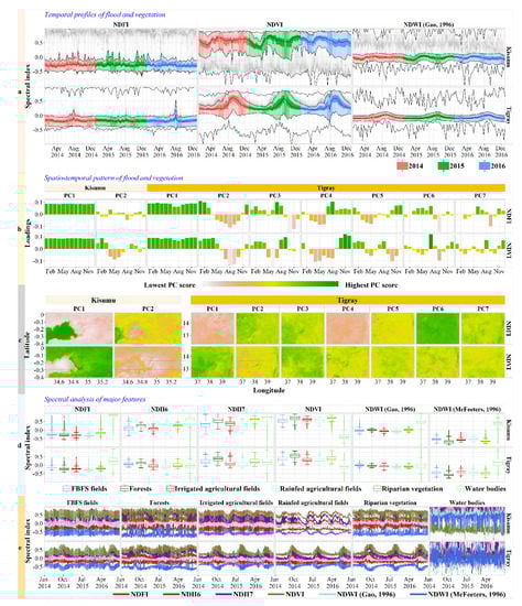 The remaining principal components related to NDFI in Tigray are not very conclusive but appear to describe ecological systems experiencing floods at different times of the year. Principal components related to NDVI paint a clearer picture. For example, the second principal component appears to describe croplands, as indicated by the stable correlation with NDVI between May and December, the period that corresponds to the growing season (Figure 5b). This is also visible in Kisumu, where this second principal component is negatively correlated with the NDVI between April and August. The analysis showed that some areas in Tigray experience more than one growing period (Figure 5b). This is indicated by a vegetation peak around April and May, which was not clearly apparent in the NDVI plot (Figure 5a). This suggests the presence of patterns that can better be detected with a multivariate approach than by a single-indicator analysis. The signatures of most of the land use types we considered are not statistically different, meaning that these land use types cannot be differentiated based on thresholds relying on normative statistical difference (Figure 5d). Only riparian vegetation seems to have particular reflectance values, but even these are not always statistically different from the values recorded in other land use types. The ranges of the normalized difference spectral index values with regards to FBFS fields are very similar to those of other ecological systems (Figure 5d,e).