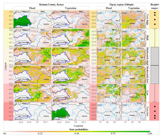 Probability of different levels of vegetation and flooding in Kisumu County, Kenya, and Tigray, Ethiopia. Flood is estimated using the normalized difference flood index. Vegetation is estimated using the normalized difference vegetation index. The shadings highlight different states of flood and vegetation with Very low corresponding to the range of lower outliers, Low corresponding to the range from the lower bound of the confidence interval to the 25% quantile, Moderately low corresponding to the range from the 25% quantile to the median, Moderately high corresponding to the range from the median to the 75% quantile, High corresponding to the range from the 75% quantile to the upper bound of the confidence interval, and Very high corresponding to the range of upper outliers. This figure illustrates some parts of the computation of spatial data nodes. Blue, light blue, and black lines, respectively, demarcate lakes, rivers, and administrative boundaries.