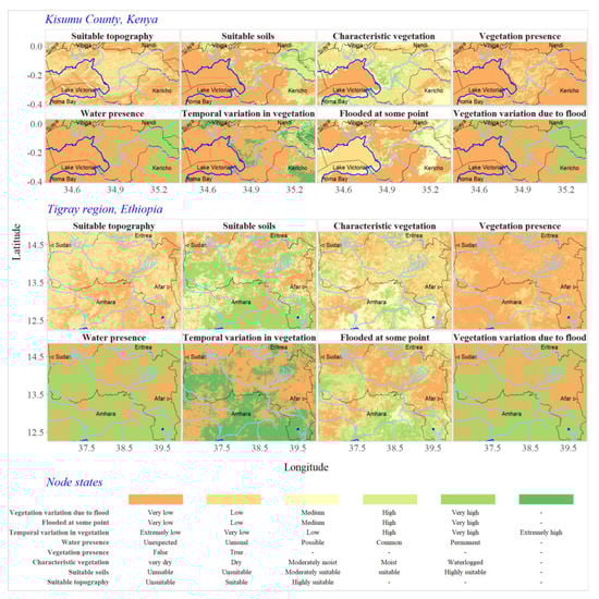 The stochastic nature of the floods that drive most ecological processes in FBFS makes conditional reasoning helpful in incrementally reducing uncertainty in the prior estimates (Figure 7 vs. Figure 8 vs. Figure 9). Using a Bayesian reasoning engine, as employed in our analysis, minor spatial variability in environmental variables can be exploited to detect patterns in the general environment, even where none of these variables by themselves are strongly linked to the landscape attribute of interest. For example, the causal model was able to detect FBFS practices in relatively rough topography, as encountered in Tigray, where FBFS are found on hillsides that are terraced for water harvesting [4,8]. Yet the model was also able to identify the more intuitive type of FBFS in flat environments, which are dominant in Kisumu County. Despite their importance for supporting FBFS, floods themselves were less important in our detection algorithm compared to their effects on primary production more generally, which also affects natural vegetation. Attempts at mapping FBFS that rely on flood detection alone can be misleading, highlighting the importance of causal reasoning in mapping such systems. In general, remote sensing of FBFS should focus on assessing easily observable surface states while considering conditions that need to be met for making a given area suitable for the practice. In Lake Victoria, for instance, the model distinguishes water hyacinth plants, which do not respond much to variation in water availability, from vegetation on land in the posterior estimates (Figure 7 vs. Figure 8). The model was thus able to reason that an area exhibiting permanent presence of water and vegetation is not suitable for FBFS (Figure 10; Figure 11).