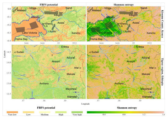 Estimates of potential areas for flood-based farming in Kisumu County, Kenya and Tigray, Ethiopia using a mapping procedure based on an expert-informed Bayesian network. The FBFS potential maps show estimates of the suitability of each pixel for flood-based agriculture. Shannon entropy is used as a measure of uncertainty regarding the suitability of each pixel for flood-based agriculture. Blue, light blue, and black lines, respectively, demarcate lakes, rivers, and administrative boundaries. Transparent black features are validation polygons.
