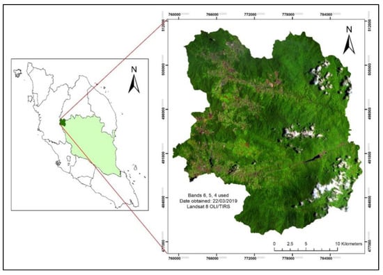 This study was conducted in the Cameron Highlands district, which is located in the western part of Pahang state and is defined as a highland area, ranging from 4°35′55.40″ N latitude and 101°29′07.05″ E longitude (Figure 1). Cameron Highlands sits at an altitude between 300 and 2060 m above sea level, and its total area is approximately 69,699 km2. As of the 2019 census, the minimum temperature is 12 °C and the maximum temperature is 34 °C [27]. The area is used for tourism and plantations due to its cold year-round climate. Although most flat areas are urban areas, hilly areas are perfect for tea, vegetables, and fruit crops. Vegetation found in this region is considered rare or endemic because growth in the climatic conditions of Cameron Highlands differs from that of the low-land climate.