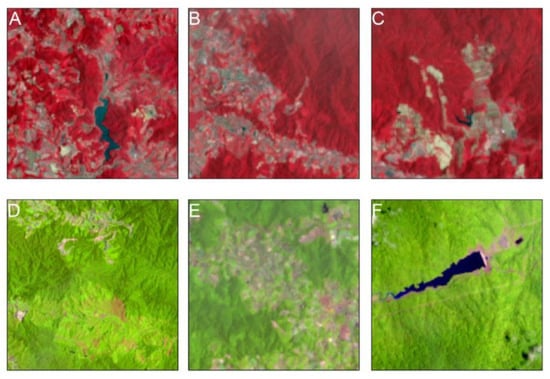 Band combination 5,4,3 shown in image (A) (Ringlet lake in the middle surrounded by primary forests in dense red, while urban areas are shown as light gray), (B) (primary forest surrounds urban areas and farms. Farms can be distinguished by the slightly reddish tone with a mixture of light green) and (C) (cleared lands seen with a bare earth color, white-gray amidst primary forest around). Band combination 6,5,4 shown in image (D) (cleared lands has a light brown color in a lighter green tone of farms. Cleared lands are also identified as a lighter brown-white color tone when it has been cleared for weeks and left under the sun), (E) (urban areas in a purple tone surrounded by farms seen as light pink), (F) (water bodies-Ulu Jelai hydroelectric plant. Urban area towards the east of the dam in a light brown-purple color tone. The area is surrounded by primary forests seen as a darker shade of green; similarly, in (D)).