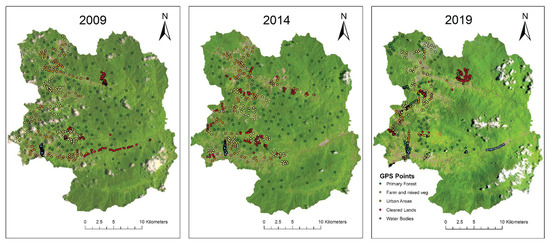 The accuracy of the OBIA classification for 2019 was validated using a ground-truthing assessment of GPS points collected from the study area. The results are applied in Figure 6. The producer’s accuracy value was 94.60% and the user’s accuracy value was 94.65%, resulting in an overall accuracy of 94.60%. Details of the confusion matrix table can be found in Table 6. Notably, only the classification results of 2019 could be validated given the availability of GPS points, and images from other years were unable to be validated. Hence, for the years 2014 and 2009 (shown in Table 7 and Table 8, respectively), the confusion matrix was derived using Google Earth to validate the accuracy (see Figure 7).