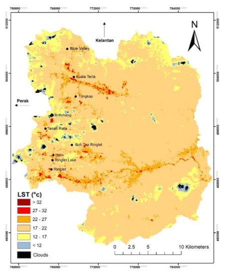Little is known about deforestation and land cover dynamics and their effects on land surface temperature (LST), particularly in highland areas. Cameron Highlands is situated in Malaysia at an elevation between 300 and 1800 m. The average temperature recorded at the main town, namely Tanah Rata, is 18 °C. The daily minimum temperature is 15 °C, with a deviation ranging from 5 to 7 °C. The temperature has steadily increased since the mid-1970s [1]. The warmest year was 1998 and 2002 was the second warmest. Recent deforestation has possibly contributed to the warming and increased LST. Previous studies using satellite observations indicate that tropical deforestation results in warmer and drier conditions at the local scale. LST is related to the surface energy balance and the integrated thermal conditions of the atmosphere within the planetary boundary layer [2]. The rise in LST could be a direct result of deforestation due to the expansion of urban zones and the overall global surface temperature rise caused by the reduction of the ozone layer.