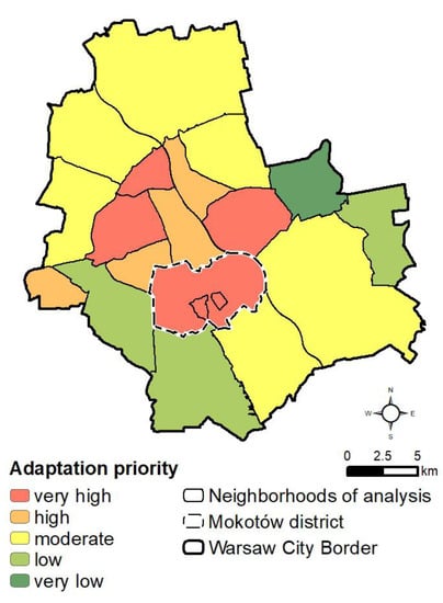 Warsaw will be negatively affected by climate change, in particular the increase in number and intensity of hot days [74] and frequency of precipitation that causes local flooding [68]. The ranking of the adaptation priority shows differences among districts.