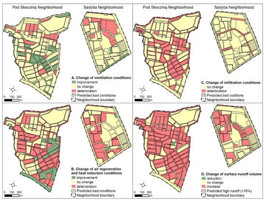 Changes in hydrological and climatic performance in neighborhoods: (A) Change of ventilation conditions, (B) Change of air regeneration and heat reduction conditions, (C) Change of infiltration conditions, (D) Change of surface runoff volume.