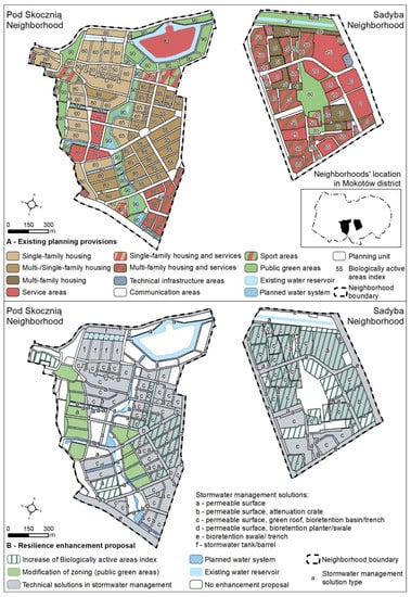 Some adaptation tools identified in Table 1 were introduced in the neighborhoods. These tools included biologically active area index, maximum building height, urban structure, and selected technical solutions (green roofs, permeable pavements) for which optional recommendations were made. Moreover, sustainable rainwater management has been introduced as a rule in Pod Skocznią, while it remains only a recommendation for new investments in Sadyba.