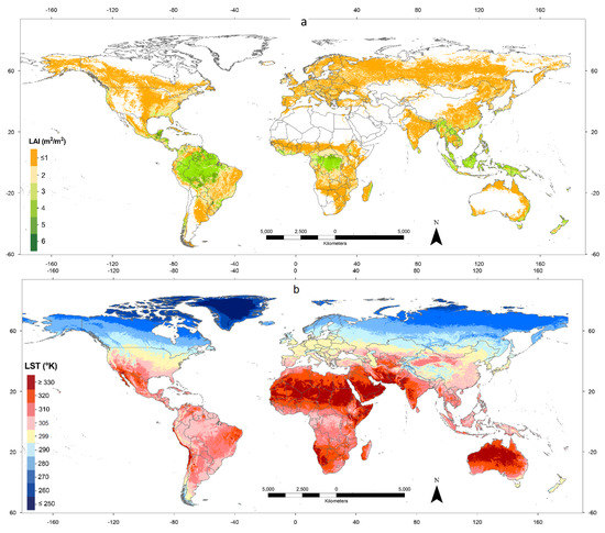 The LAI product (“MODIS/006/MCD15A3H”) was used to compute the spatial distribution of the global mean LAI for 2018 (Figure 1a). In 2018, large greening was observed around the southeast region of North America, the Amazon in South America, Central Africa, and Southeast Asia. Likewise, the LST product (“MODIS/006/MYD11A2”) was used to compute the spatial distribution of the global mean LST for 2018 (Figure 1b). The regions with higher LST include Southwest America, northeastern Amazon, North Africa, West Africa, Australia, and some parts of the southwest of Asia. All regions with the largest greening, as observed in Figure 1a, consistently demonstrate a moderate LST of 302 to 307 K.